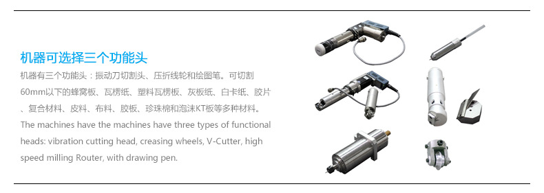 The configuration of vibration knife, drag knife strokes, tools and optional half knife, cutter, slotted knife, knife, cutter, indentation knife and other tools, can achieve the office of line drawing, cutting, cutting, dotted half cut off all the cutting and milling cutter cutting, various materials, V-CUT slot milling, pressing wheel, indentation size the utility function and so on scratch hard materials.