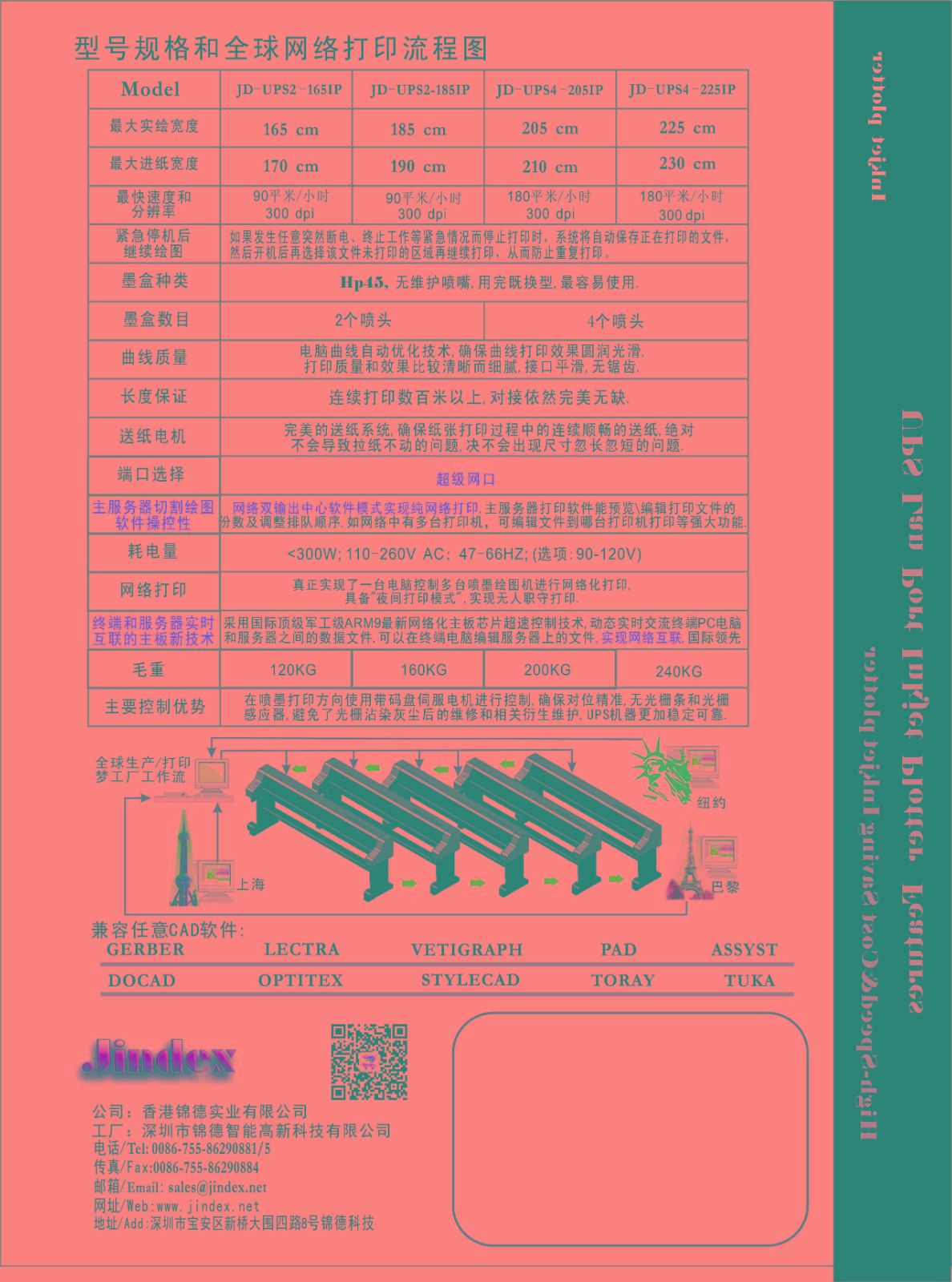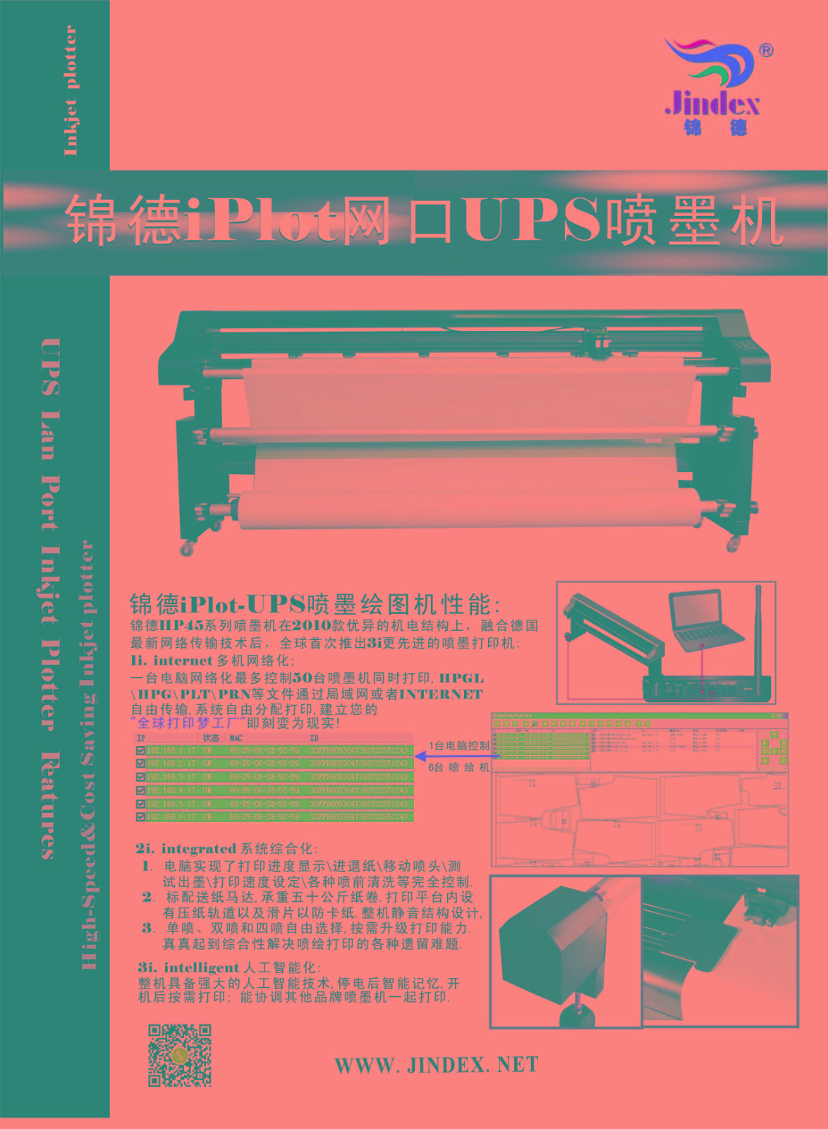 高速噴墨繪圖儀打樣效果清晰,性能穩(wěn)定,精確度達(dá)到國(guó)際標(biāo)準(zhǔn); 標(biāo)準(zhǔn)機(jī)型雙噴墨,可升級(jí)4噴(比雙噴速度快1.5倍) 全球首家前置雙送紙系統(tǒng)